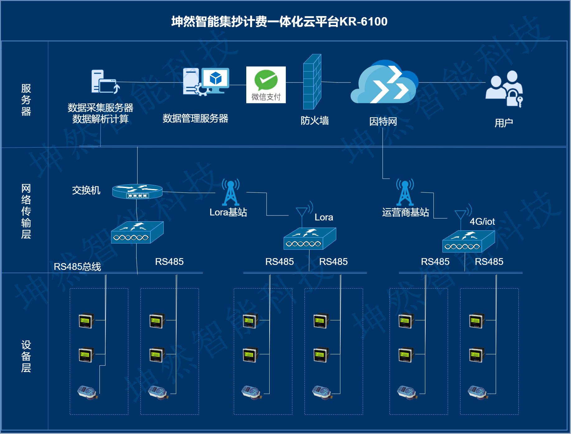 《坤然智能KR-6100集抄計(jì)費(fèi)一體化云平臺》由系統(tǒng)中的各計(jì)量裝置、數(shù)據(jù)采集傳輸終端、數(shù)據(jù)中心組成。